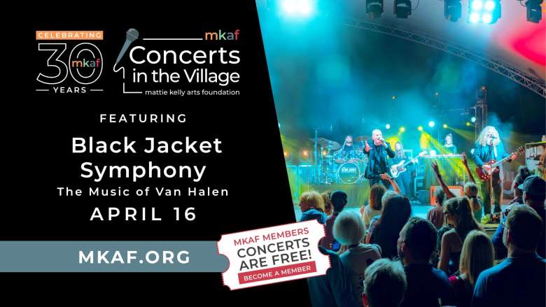 Black Jacket Symphony live at MKAF’s Concerts in the Village Thursday, April 16th. Gates open at 6 p.m. with concerts beginning at 7 p.m. for this come-as-you-are family-friendly outdoor concert series. Bring a lawn chair, picnic, wine, or purchase food and beverages on-site prepared by featured restaurants and food trucks.