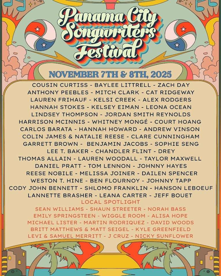 Downtown Panama City, Florida will be home to the area’s 7th Annual Songwriter Festival, November 7 & 8, 2025. Featuring original songs by local, regional and national musicians, Historic Downtown Panama City’s most notable art galleries and performance spaces will transform into intimate music venues for this one-of-a kind festival. See the lineup below!